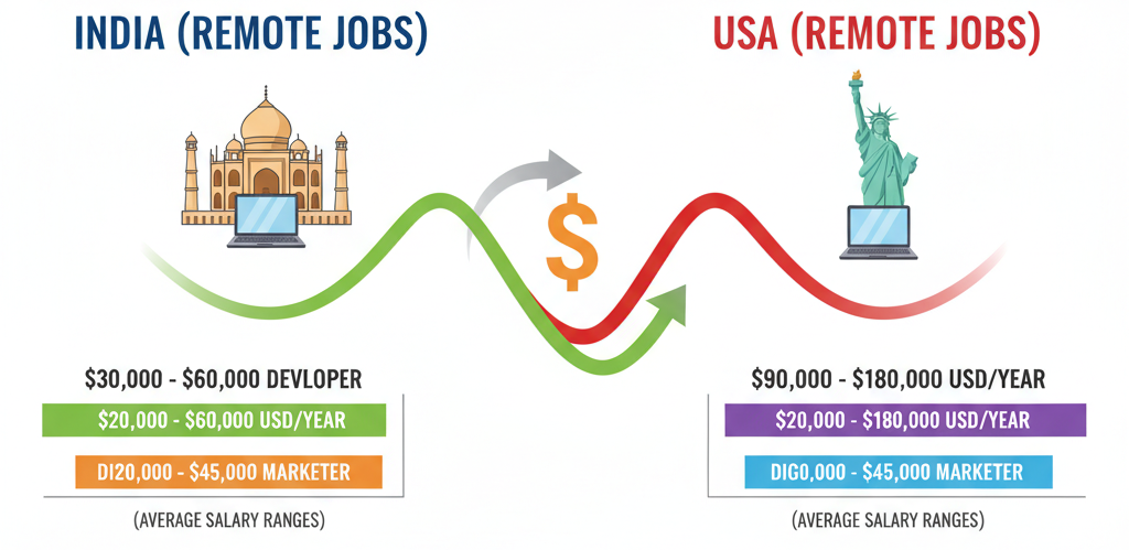 When comparing remote jobs in India vs the USA, the salary gap remains wide, with American workers earning significantly more. However, opportunities are shifting as global firms adopt skill-based compensation. Indian professionals with advanced skills and experience in tech, marketing, or specialized fields can increasingly compete in the international market.